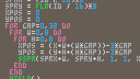 Yes, that should do nicely. Lots of that going off on the screen when blocks get hit. It’s also only 146 code units long. Pico 8 is pretty smart, on the surface it’s a toy that can be programmed, and low quality 8-bit style games that are pretty short in duration can be created. Under that however is a deeper system with some optimisations and pretend direct memory access for fun effects and tricks.